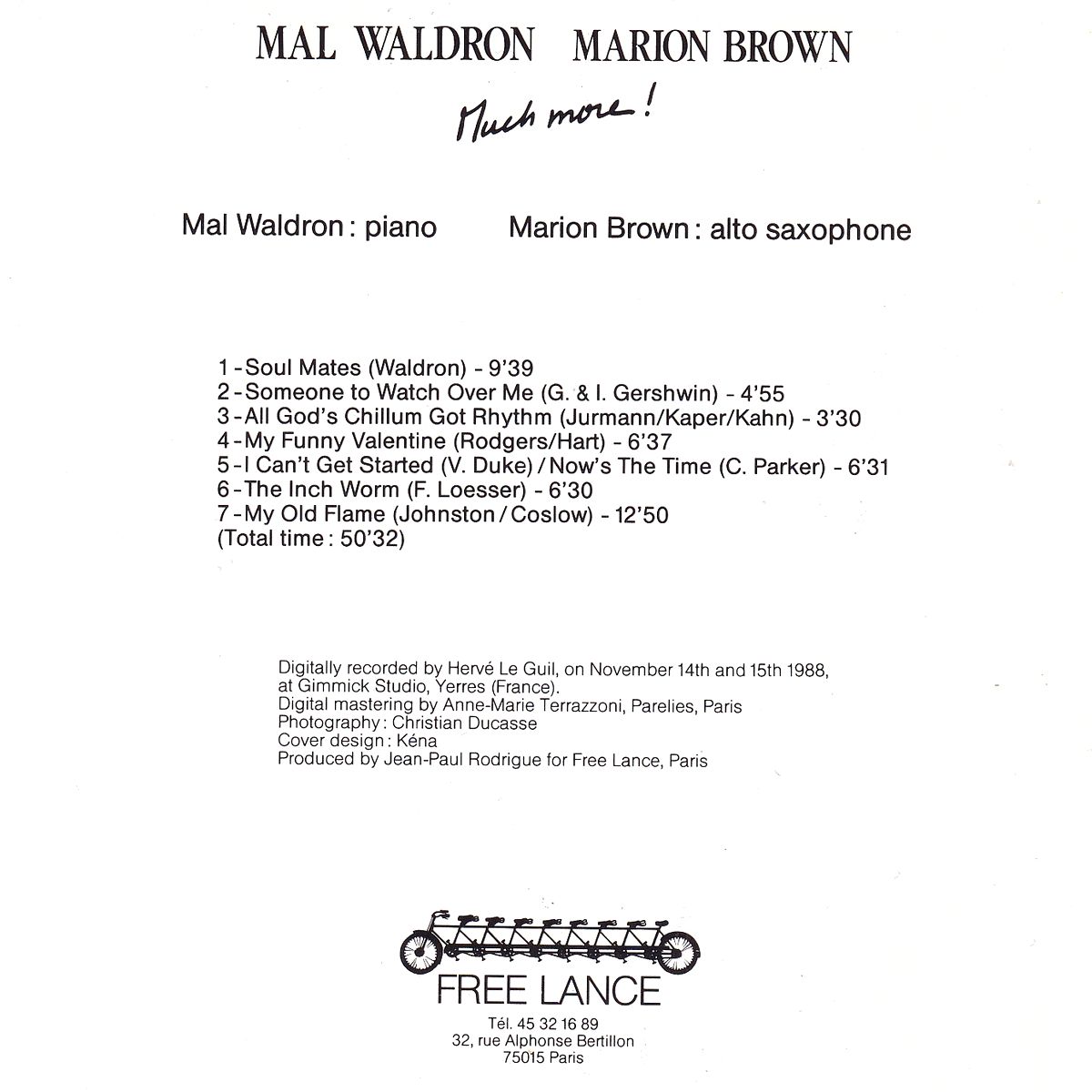 Much More! is a collaborative jazz album by American pianist Mal Waldron and saxophonist Marion Brown, recorded in 1988 and released in 1989 on the Free Lance label. It serves as a companion to their earlier 1985 duo album, Songs of Love and Regret. and other album(Mal Waldron, Marion Brown) |